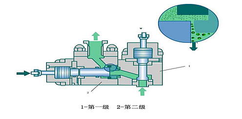 高壓泵多采用三柱塞式往復泵,由共用一根軸的三個作用泵組成,三個單作用泵的曲柄互相錯開120度,其吸液泵和排液泵也是三個泵共用。這樣,在曲軸旋轉一周的周期里,各泵的吸液或排液依次相差1/3周期,大大提高排液泵流量的均勻性。三作用泵的流量各為單作用泵的三倍。均質閥安裝在高壓泵的排出路上,由閥座、閥桿和沖擊環組成,G外多采用鎢鈷鉻合金(用于牛奶均質)或硬質合金(腐蝕性強的液料)等制成,而G內多采用4Cr13。目前多數高壓均質機均采用二級均質閥,以獲得更均勻更細小的乳化粒子。以下即為一級、二級均質閥的結構圖及雙擊均質閥工作示意圖。