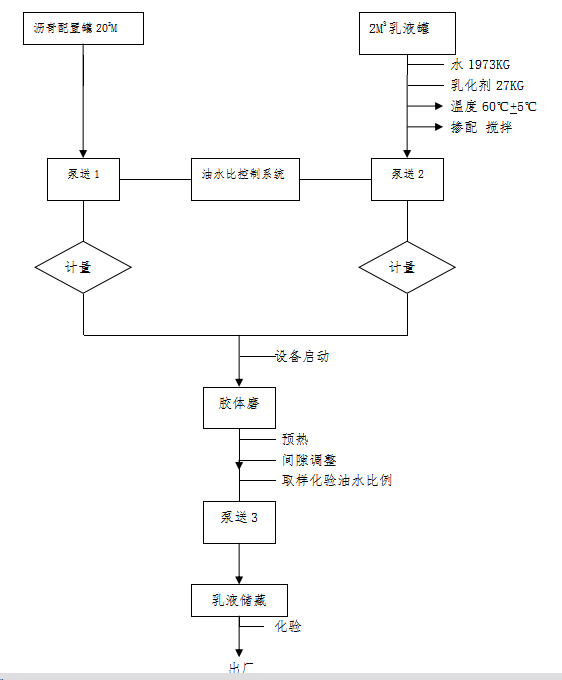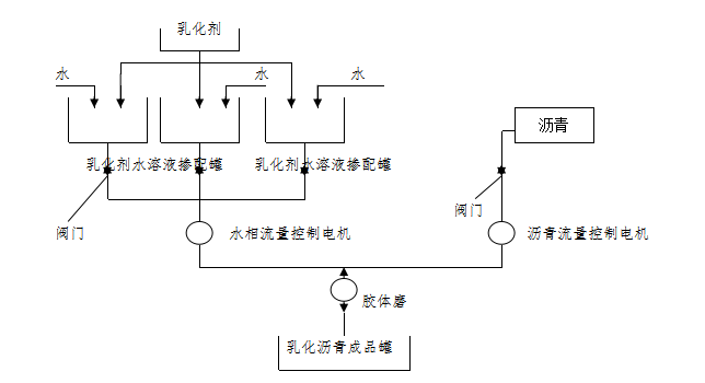 乳化瀝青生產(chǎn)流程大致分成瀝青配制、乳化劑水溶液配制、瀝青乳化和乳化瀝青儲(chǔ)存四個(gè)主要程序。