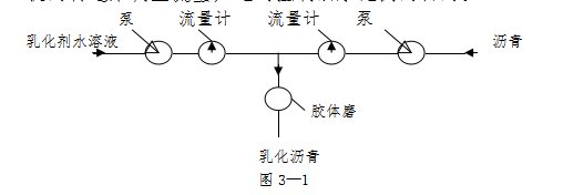 乳化工藝有很多種。圖1—1是宿遷市公路工程建設(shè)處乳化瀝青生產(chǎn)工藝,是一種陽(yáng)離子中裂乳化劑的乳化工藝。