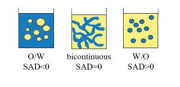 Salager用表面活性劑親合力差值SAD(Surfactant affinity–difference)定量地表示陰離子破乳劑的反相點: