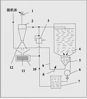 1和8.控制閥 2和5.漩渦分離器 3.溢流閥 4.密封箱 6.液壓泵 7.儲液箱 9.管路 10.磁性分離器 11.過濾箱 12.回收器